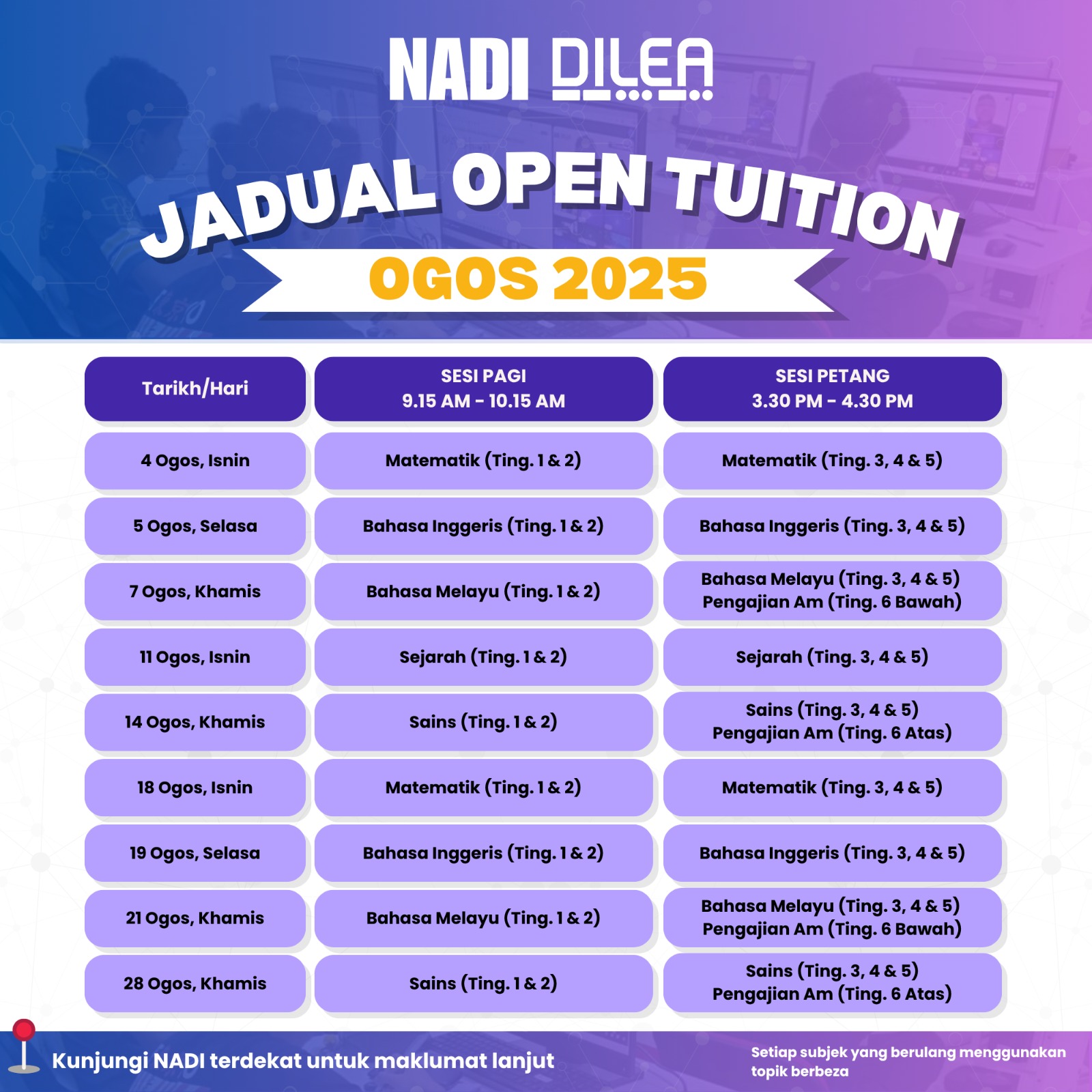NADI-Nurture DILEA Digital Learning – Jadual Open Tuition Ogos 2025
