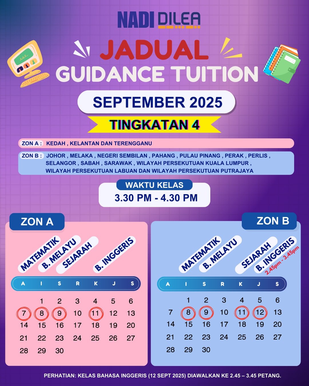 DILEA Digital Learning – Jadual Guidance Tuition September 2025 (Tingkatan 4)